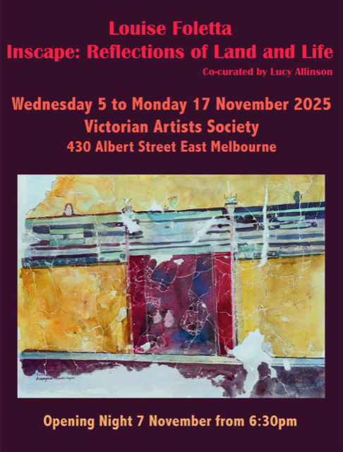 The exhibition, titled Inscape: Reflections of Land and Life, will be held at the Victorian Artists Society galleries at 430 Albert St, East Melbourne. The Harvard Club will have an opportunity to preview the exhibition on 6 November 2025, with a short talk, as well as a discussion with Louise about her work. This event will run from 6:00-8:00pm. Finger food and Utter Wines will be served.